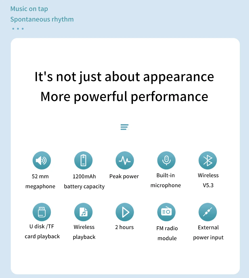 • Bluetooth 5.3:With Bluetooth 5.3, this speaker provides a stable and fast connection to your device.